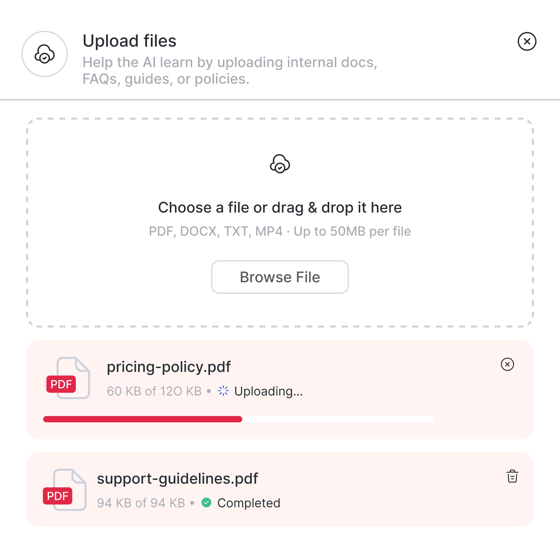 Upload your FAQs, help docs, and product content so the AI understands your business and speaks in your tone.